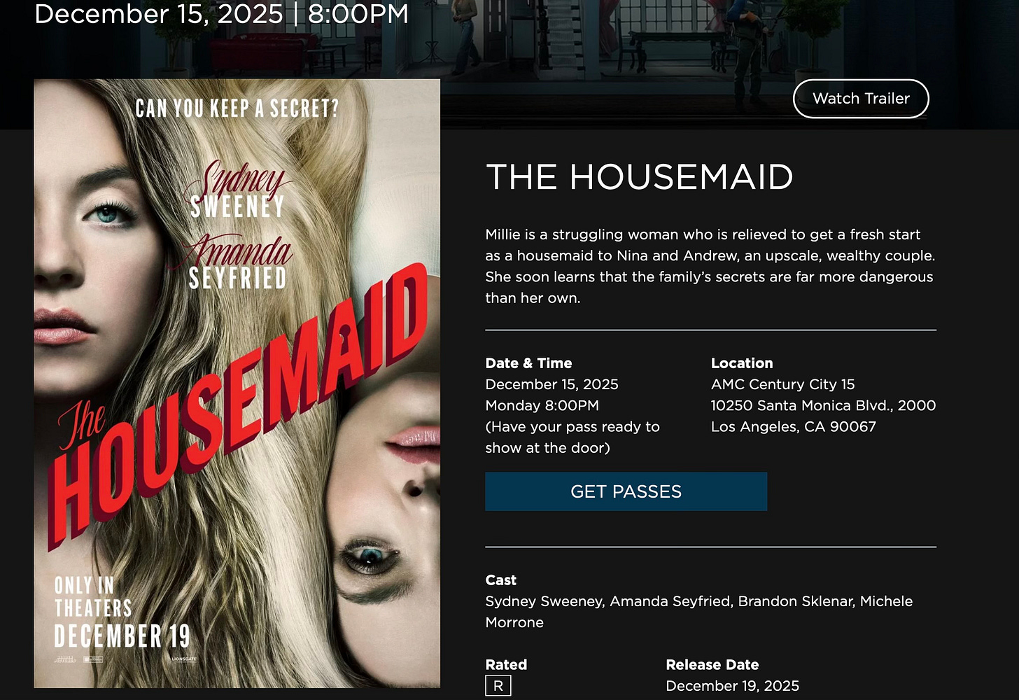 Up to 30 tickets (first-come, first-serve) to a screening of “The Housemaid” on Monday, December 15th at 8 pm at AMC Century City 15. Get your passes here.