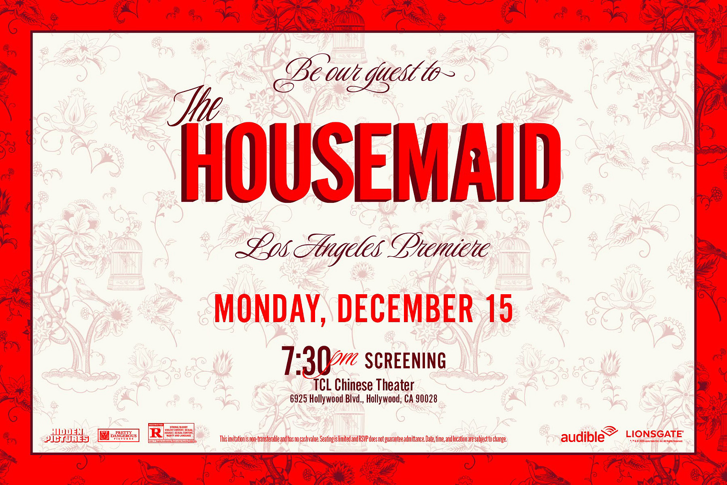 Two tickets to the L.A. premiere of “The Housemaid” on Monday, December 15th at 7:30 pm at TLC Chinese Theater in Hollywood. The first person to comment here gets the tickets!!