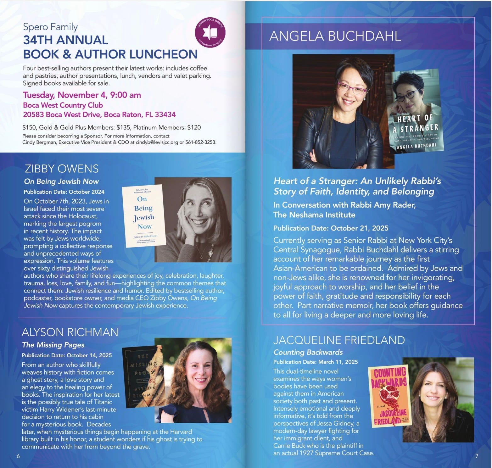 Tuesday, November 4th from 9 am - 2 pm. Adolph & Rose Levis JCC Spero Family 34th Annual Book & Author Luncheon at Boca West Country Club with Rabbi Angela Buchdahl, Jacqueline Friedland, and Alyson Richman. Tickets here.