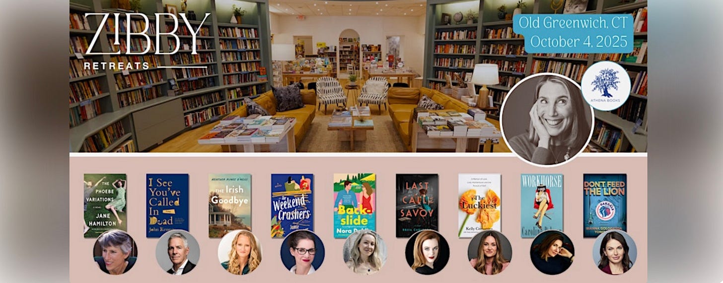 Greenwich, CT: SOLD OUT. October 4th from 9 am - 2 pm: Zibby Retreat: Greenwich with Athena Books featuring Heather Aimee O’Neill, Jamie Brenner, Nora Dahlia, Brisa Carleton, Kelly Cervantes, Caroline Palmer, Bianna Golodrya, Jane Hamilton, and John Kenney. Email here to be added to the waitlist.