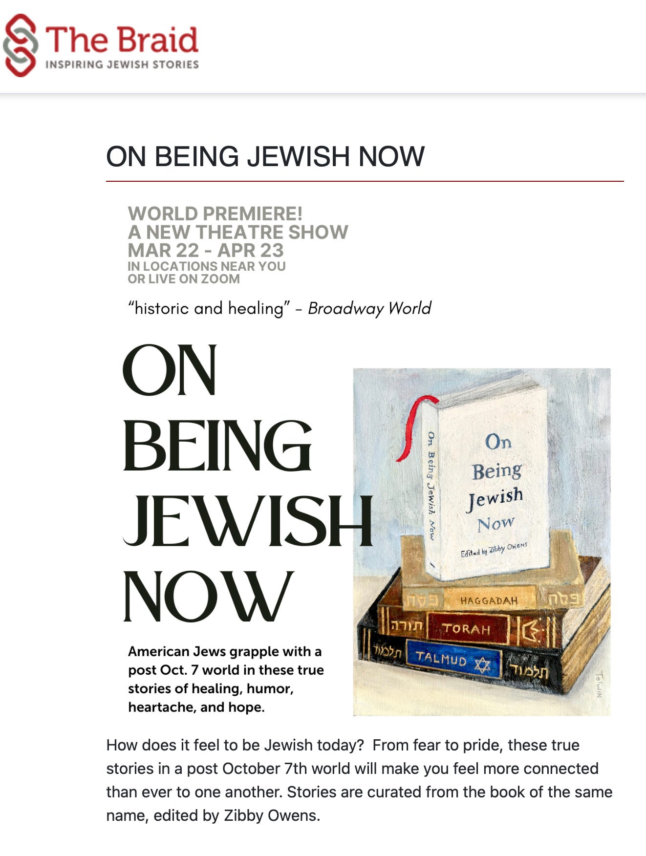 Thrilled to report that On Being Jewish Now has been adapted for the stage! Come see the Braid’s performances in March and April all over California and on Zoom. Locations and ticket information here. THANK YOU to the 75 amazing authors who made this book happen.