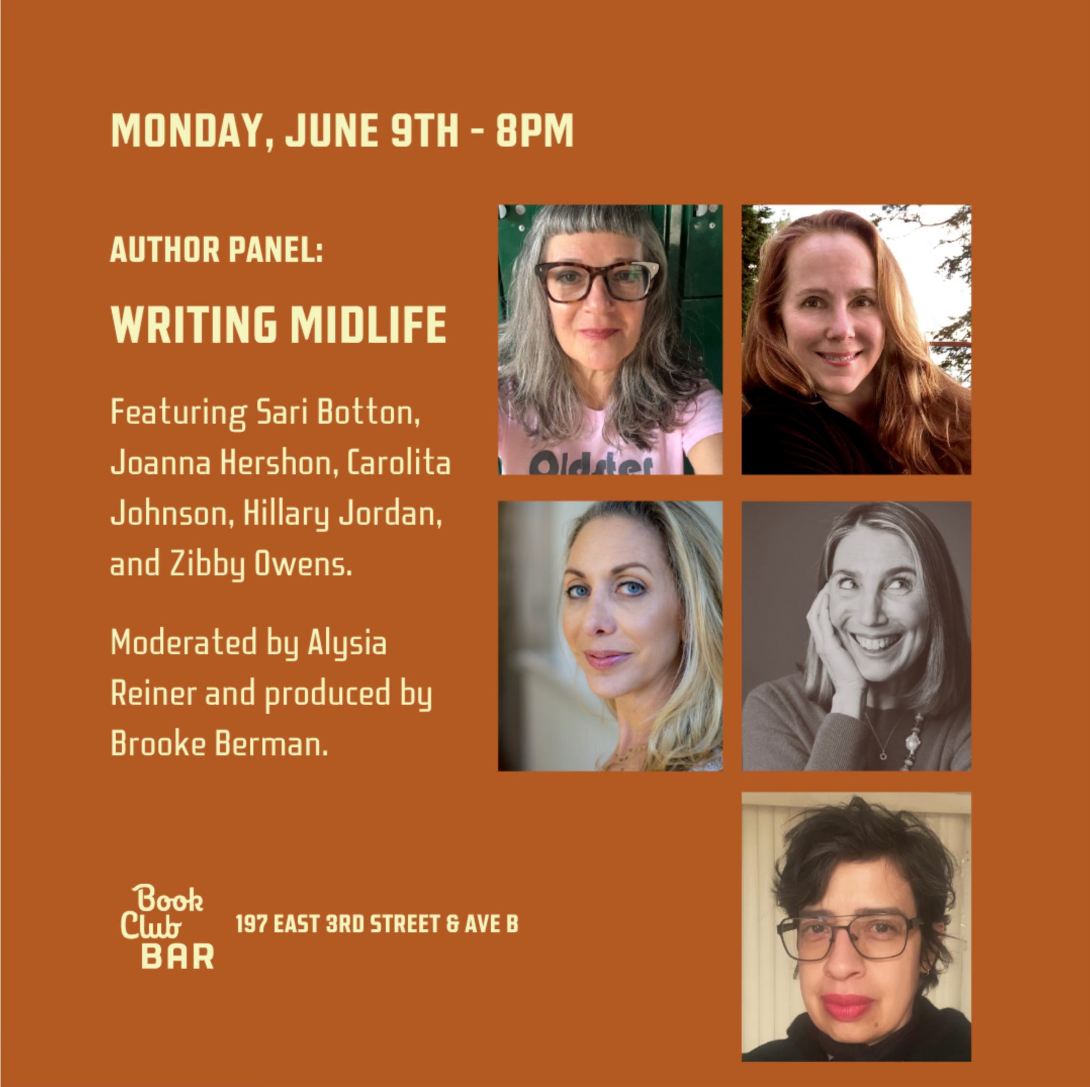 Monday, June 9th at 8 pm: I’ll be at Book Club Bar on a panel called “Writing Midlife” with Sari Botton,