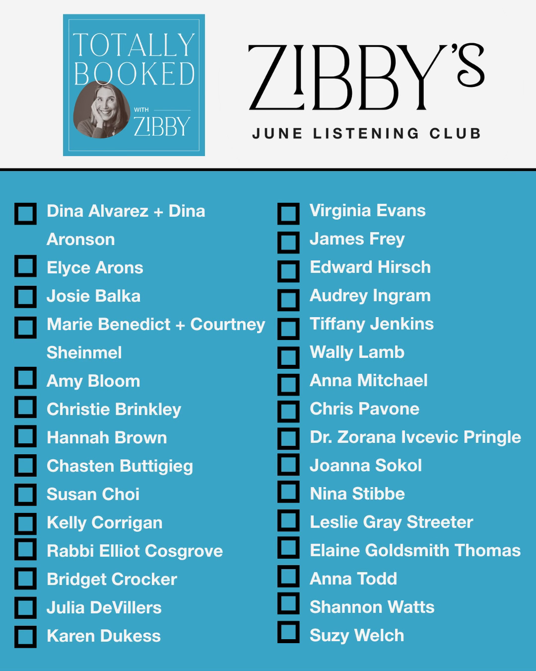 I hope you’re all taking part in my June Listening Club Challenge. Every day in June, there’s a new episode of Totally Booked with Zibby! And we’re GIVING AWAY COOL THINGS EVERY DAY. Make sure to sign up on zibbymedia.com and follow along on Instagram to comment and win! How many have you listened to?!