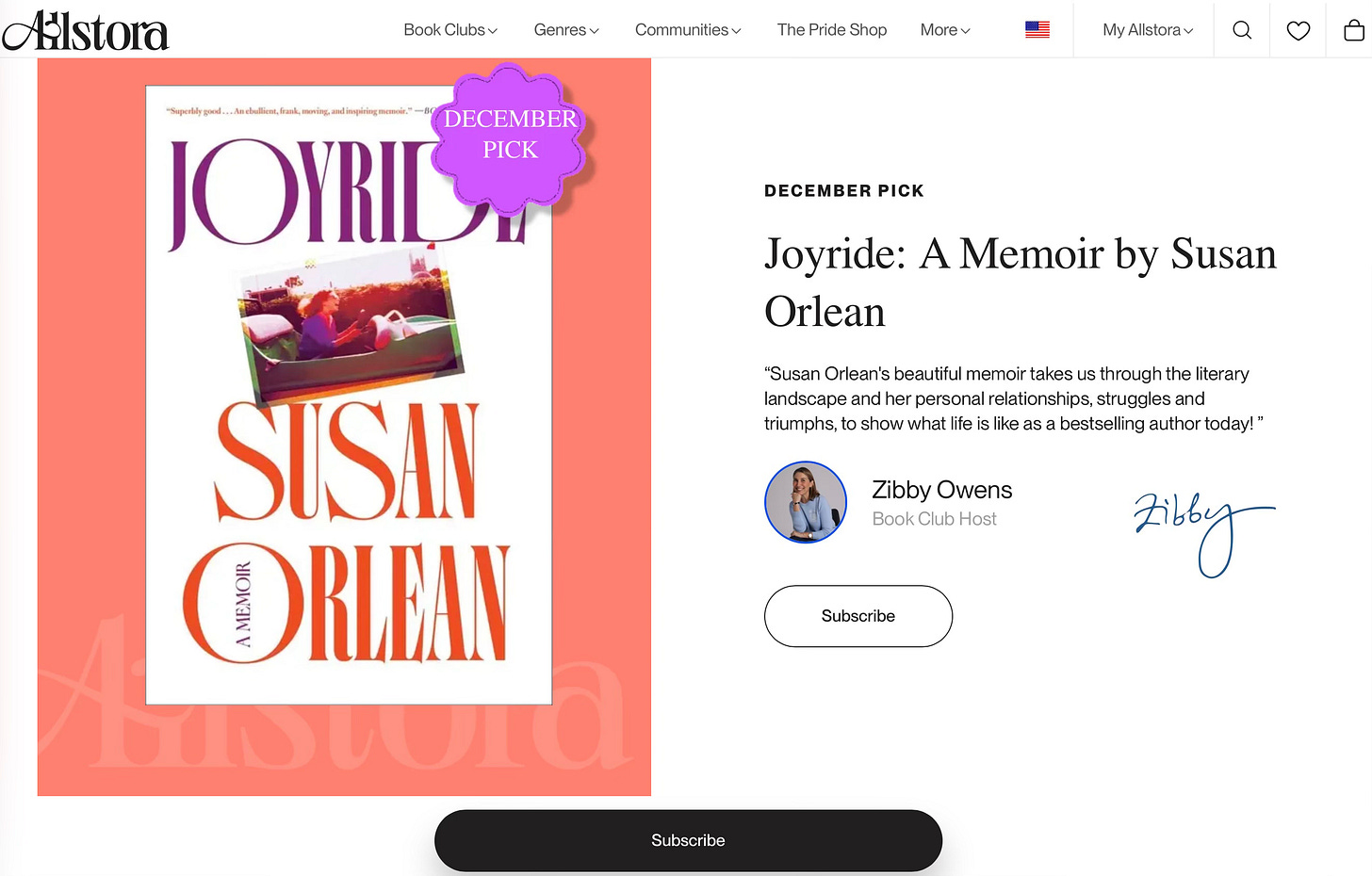 Oh, did you join my new subscription book club? Now you can get my monthly pick delivered right to your door thanks to the Allstora platform! My December pick is Susan Orlean’s Joyride which was just featured in the New York Times Book Review yesterday. Sign up here. The first month is only $1!!