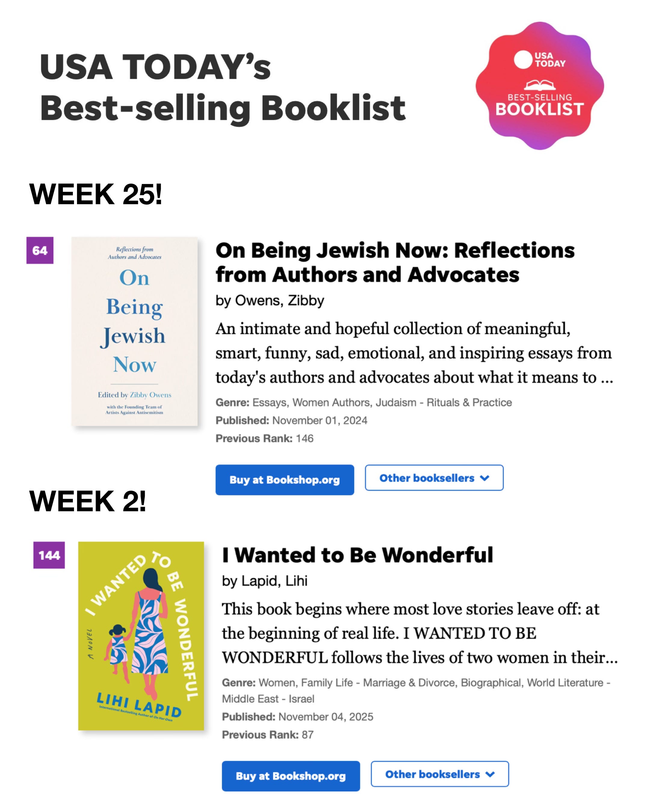 Speaking of our books, Lihi Lapid’s novel I Wanted To Be Wonderful hit the USA Today bestseller list for two weeks straight. And my anthology, On Being Jewish Now, hit for the 25th week! If you haven’t read Lihi’s intimate, powerful, slim novel and have any interest in the concepts of motherhood and marriage, you absolutely must.