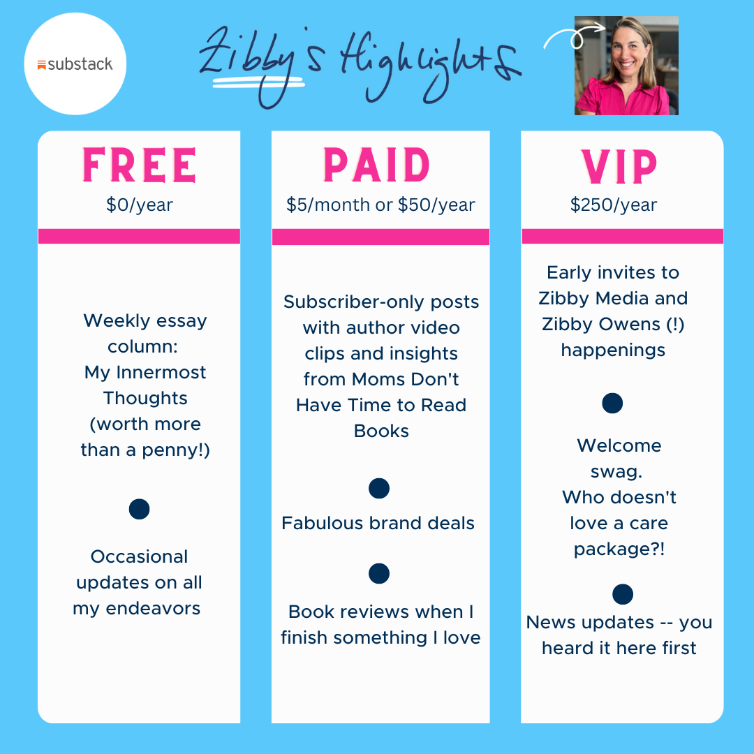 Hi! I’m so happy you’re here! I’m all about deepening the connections between authors, readers, and each other and sharing myself openly and authentically — in my literary media company Zibby Media, my daily author interview podcast Moms Don’t Have Time to Read Books, and my own writing. This Substack is place to get all of it.